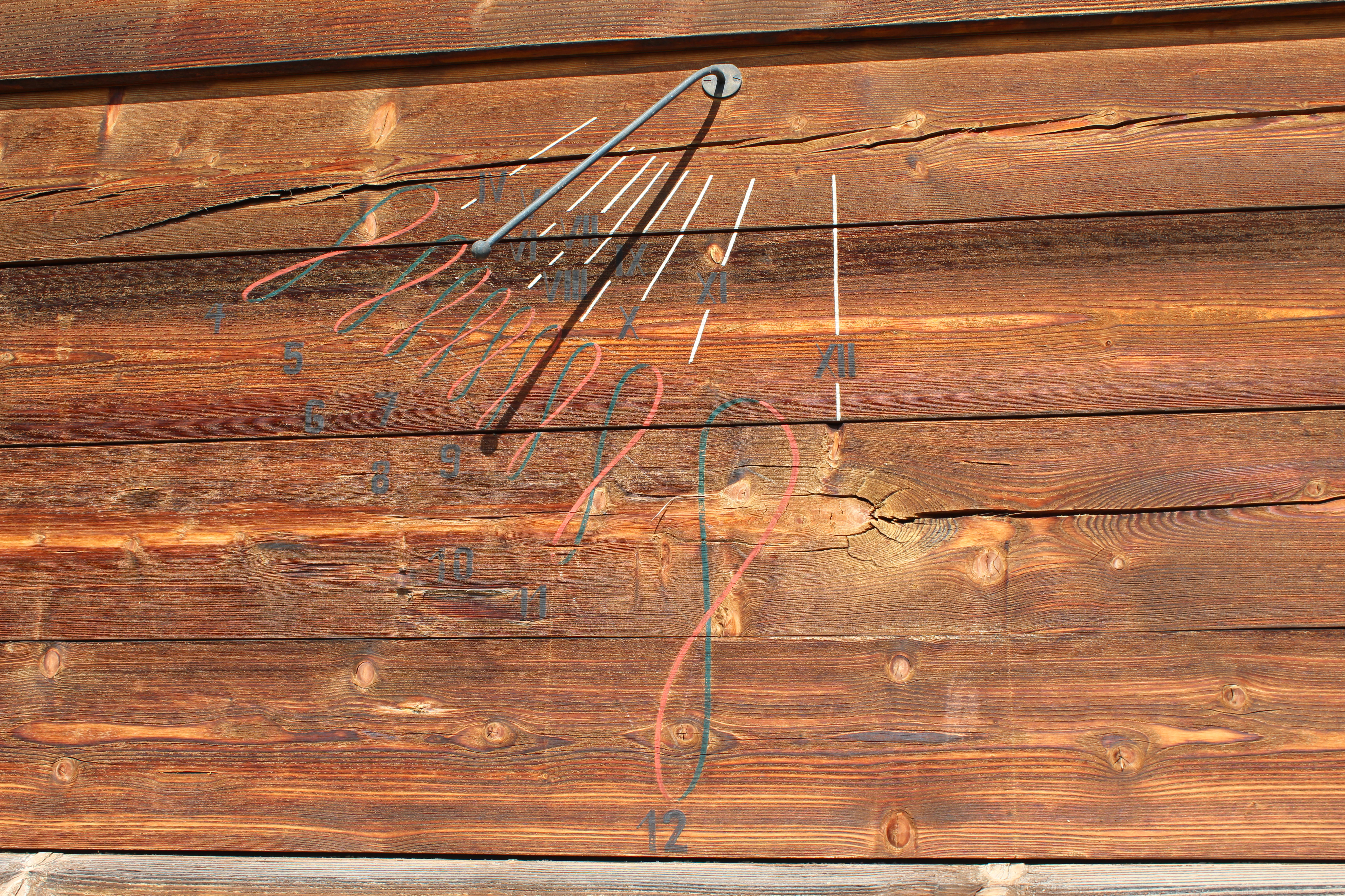 | Bemerkungen | Die Sonnenuhr ist direkt auf das lasierte rohe Holz der Hausfassade gemalt. Der Spruch ist als selbständige Einheit über der Sonnenuhr angebracht. |